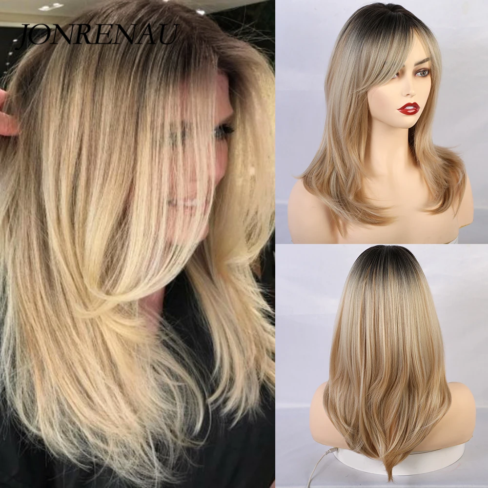 JONRENAU Synthetic Long Wig with Bang Dark Root Ombre Brown Hair Natural Wave High Quality Wigs for