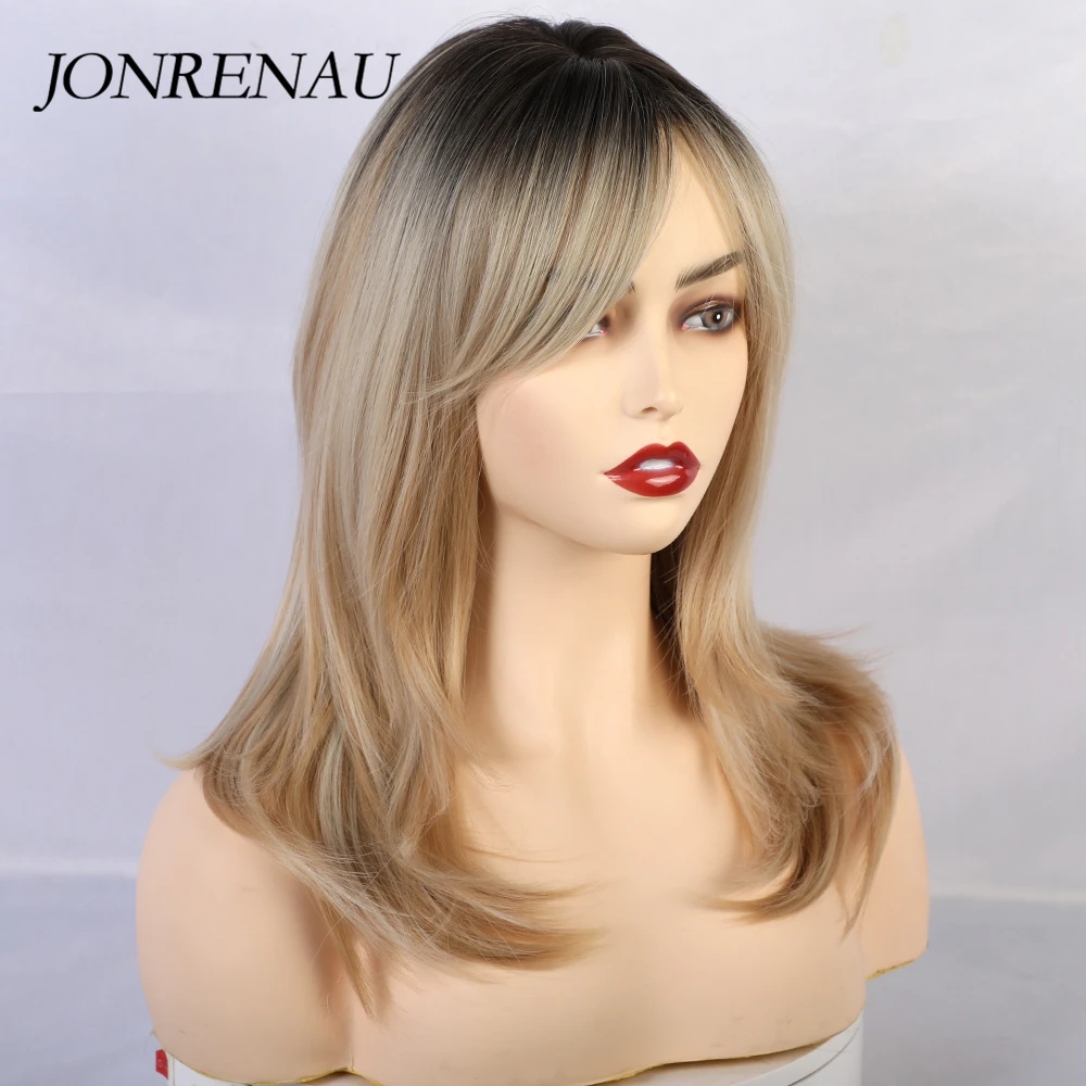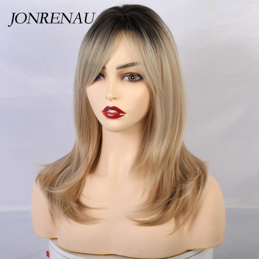 BEST QUALITY JONRENAU Synthetic Long Wig with Bang Dark Root Ombre Brown Hair Natural Wave High Quality Wigs for